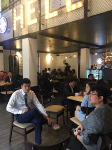 On the opening day, the store attracts a crowd of customers to check-in and enjoy drinks.